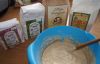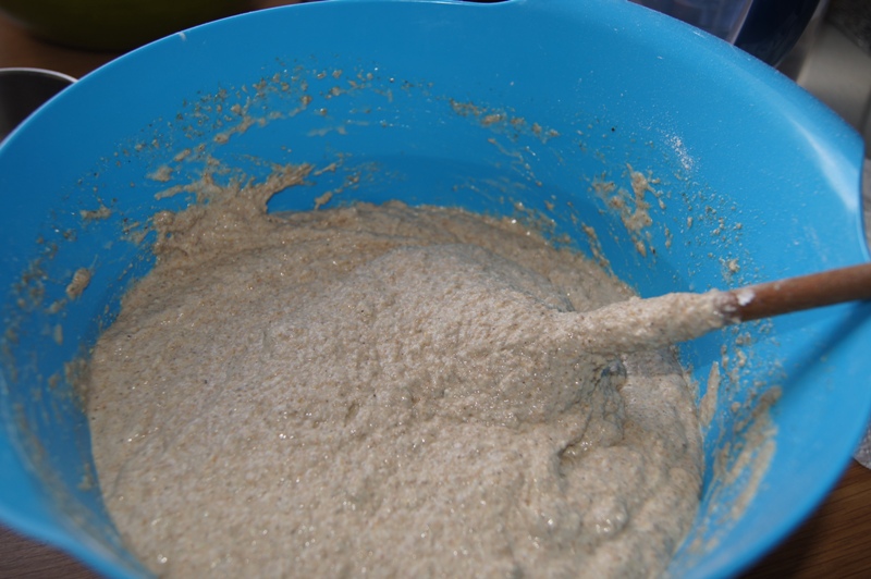 Do dużej miski wlewamy ciepłą wodę, dodajemy rozpuszczone drożdże i wsypujemy resztę składników. Wszystko dokładnie mieszamy. Nie trzeba wyrabiać anie mieszać w jakiś określony sposób.