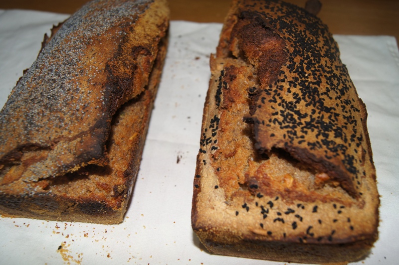 Dajemy resztę mąki, wyrabiamy i wkładamy do posmarowanych tłuszczem i posypanych bułką tartą foremek na chleb. Wygładzamy wierzch ręką namoczoną w wodzie i posypujemy na przykład makiem, siemieniem lnianym, płatkami owsianymi lub czarnuszką. Swoją drogą polecam gorąco czarnuszkę - nadaje fantastyczny smak i aromat!:)Odstawiamy w ciepłe miejsce jeszcze raz do wyrośnięcia. (kaloryfer nawet się sprawdził):)