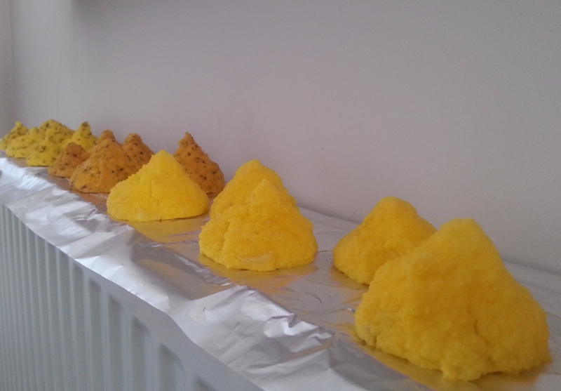 Najistotniejszy w procesie tworzenia gomółek jest następnie sposób ich suszenia. Należy je bowiem przez kilka dni podsuszać. Najlepiej w cieple, ale temperatura nie może być za wysoka. Ja położyłam na folii aluminiowej na kaloryferach. Inny sposób to podsuszać je w piekarniku ale na początek w temperaturze ok 400C najpierw przez 2 godziny, potem zrobić przerwę i znów podsuszyć ze 2 godziny. Kolejnego dnia powtórzyć proces. Generalnie gomółki się obsuszają, kurczą, a skórka twardnieje.