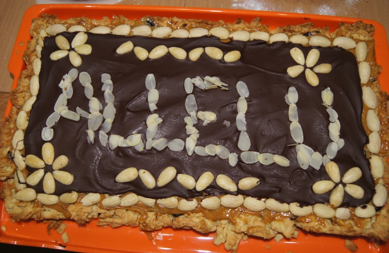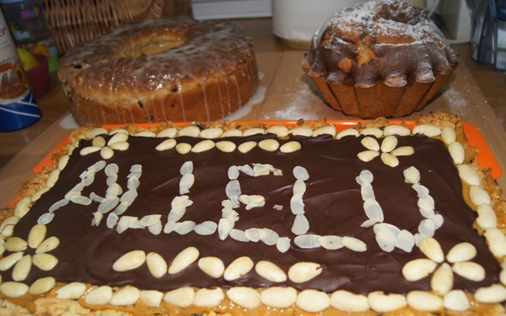 Na powidło dałam masę kajmakową. Przyznam szczerze - kupiłam gotową. Można też kupić mleko skondensowane słodzone i gotować puszkę przez 2 godzin. Jest dokładnie to samo. Na masę polałam stopioną gorzką czekoladę a do dekoracji użyłam migdałów. Cóż, czy smaczne czy nie, się okaże w niedzielę. Wprawdzie nie obyło się bez niespodzianek, bo najpierw Maksymek "poporcjował" mi górne ciasto, a potem nie zmieściło mi się całe Alleluja:), ale myślę, że smakowo będzie pysznie.