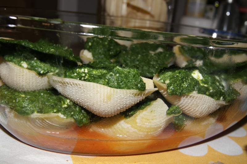 Do każdej muszelki najpierw dajemy zmiksowane mięsko z indyka i przykrywamy masą szpinakową. Muszelki układamy na pomidorach, a potem drugą warstwę.