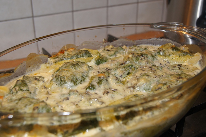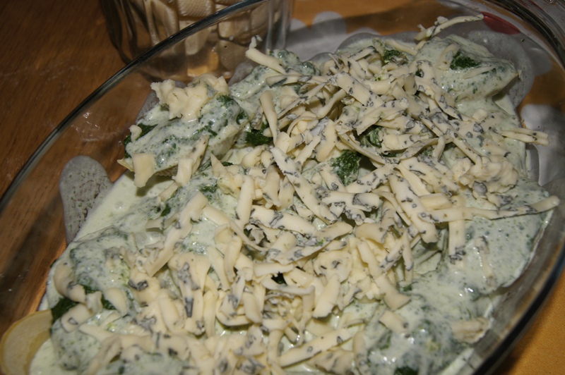 Do miski, w której był szpinak, żeby nie marnować jego resztek, wlewamy jakieś 200 g śmietany (pół dużego pojemnika, który ma 400 g) dolewamy jakieś 1/2 szkl. wody i dodajemy łyżkę mąki i mieszamy żeby nie było grudek. Dajemy troszkę soli do smaku. Muszelki zalewamy sosem śmietanowym i ścieramy na wierzch serek blue.