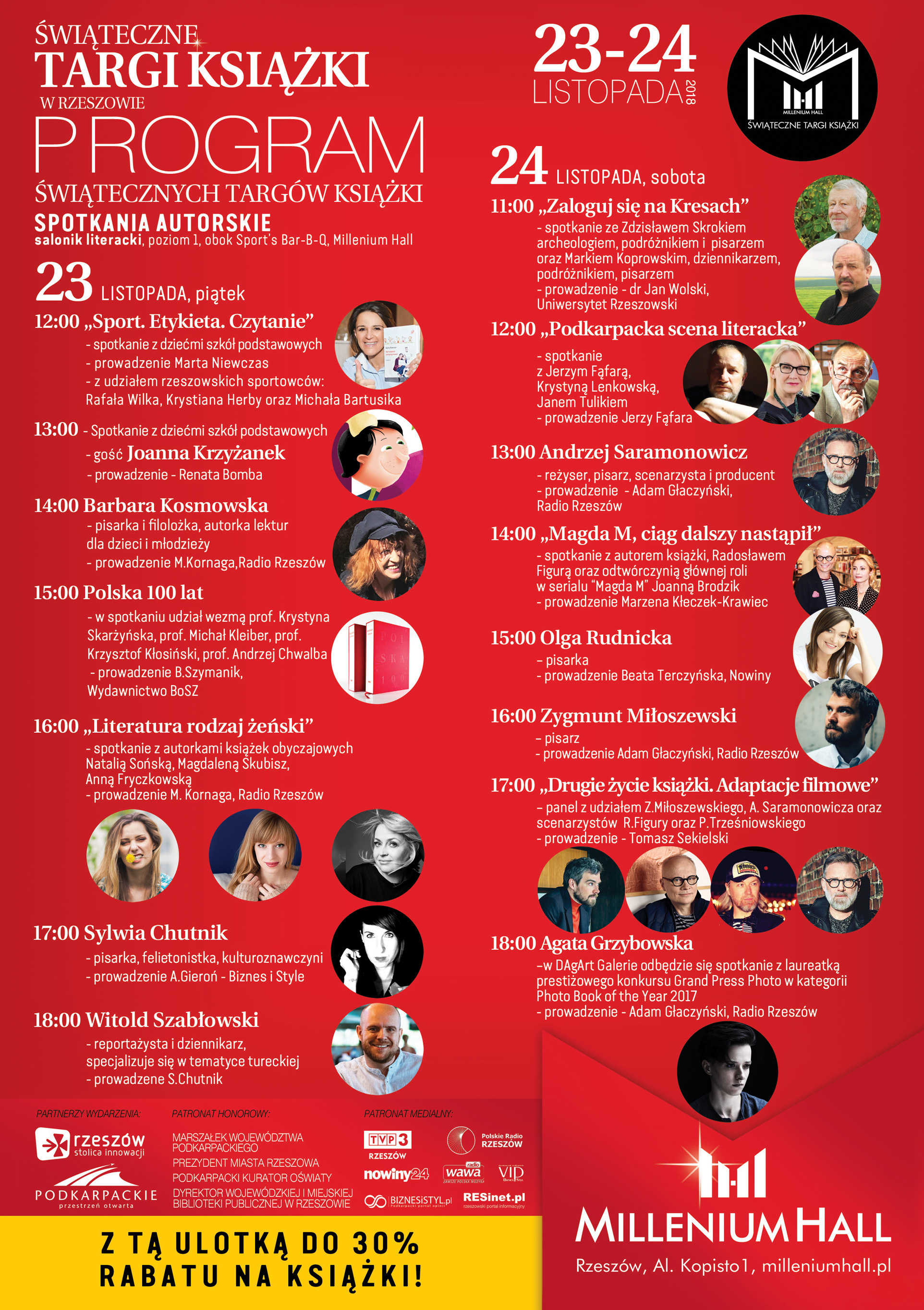 godz. 16:00 „Literatura rodzaj żeński” spotkanie z autorkami książek obyczajowych: Natalią Sońską, Magdaleną Skubisz, Anną Fryczkowską. Prowadzenie: Maria Kornaga, Radio Rzeszów