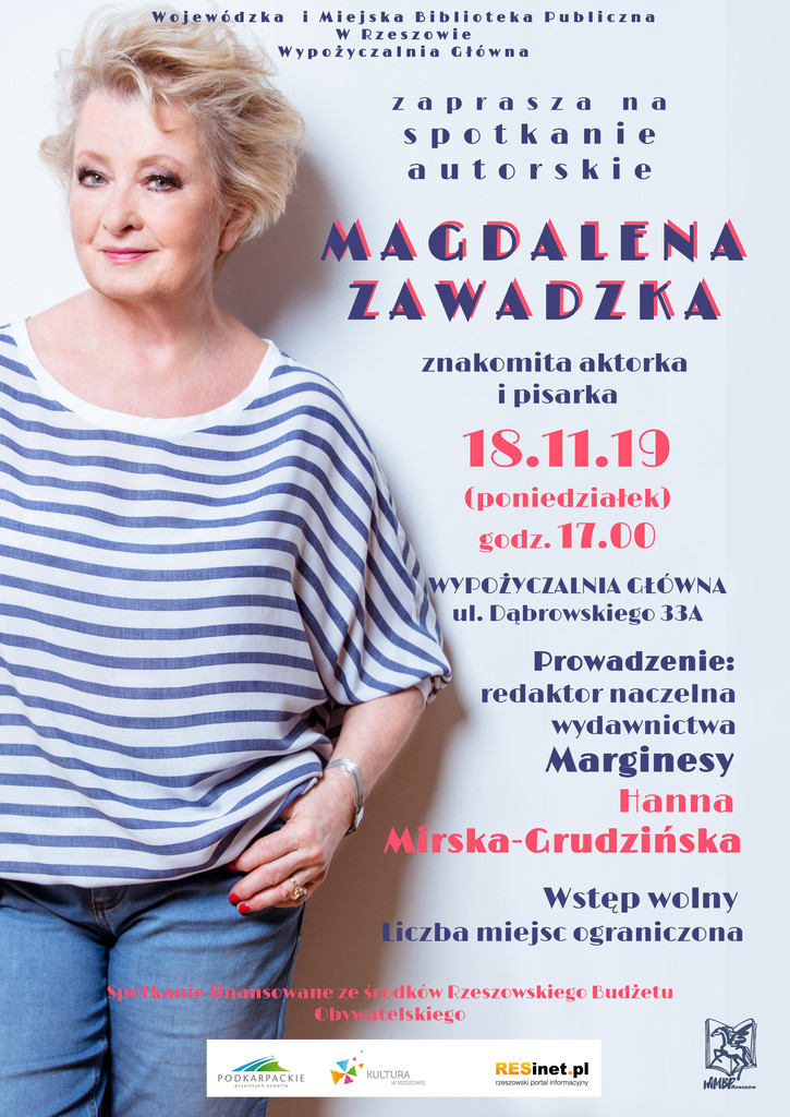 Wojewódzka i Miejska Biblioteka Publiczna w Rzeszowie zaprasza na spotkanie z Magdaleną Zawadzką, aktorką teatralną, filmową i telewizyjną, która zdobyła popularność dzięki roli Basi Wołodyjowskiej w filmie „Pan Wołodyjowski”. W poniedziałek, 18 listopada artystka odwiedzi Rzeszów i opowie nie tyle o kulisach pracy przed obiektywem, ale o swoich autobiograficznych książkach: „Moje szczęśliwe wyspy”, „Taka już jestem” oraz „Gustaw i ja”.