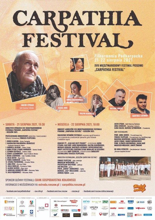 Już 21 i 22 sierpnia w Filharmonii Podkarpackiej zaśpiewają artyści z różnych stron świata podczas XVII edycji „Rzeszów Carpathia Festival” Międzynarodowego Festiwalu Piosenki 2021. Gościem honorowym festiwalu jest Jacek Cygan, a w koncercie finałowym wystąpią polskie gwiazdy: Kasia Moś, Anika Dąbrowska, Ralph Kamiński, Michał Rudaś, Bartosz Listwan!