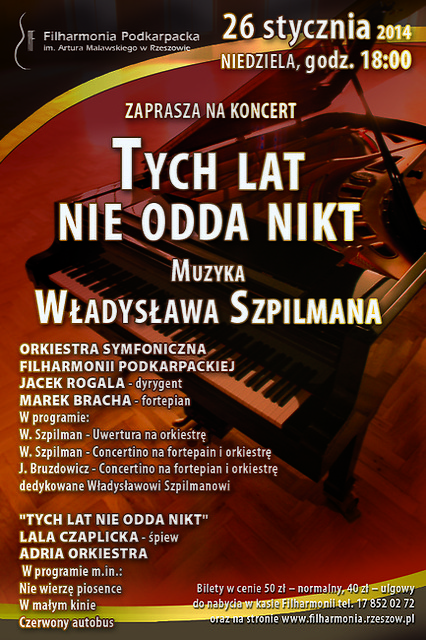Ale Szpilman był kompozytorem nie tylko piosenek popularnych, których napisał ok. 500, ale tworzył również muzykę filmową i komponował utwory symfoniczne. Niedzielny koncert w Filharmonii Podkarpackiej będzie okazją, by przypomnieć sobie te piękne melodie. Koncert „Tych lat nie odda nikt” odbędzie się w niedzielę o godz. 18.00.