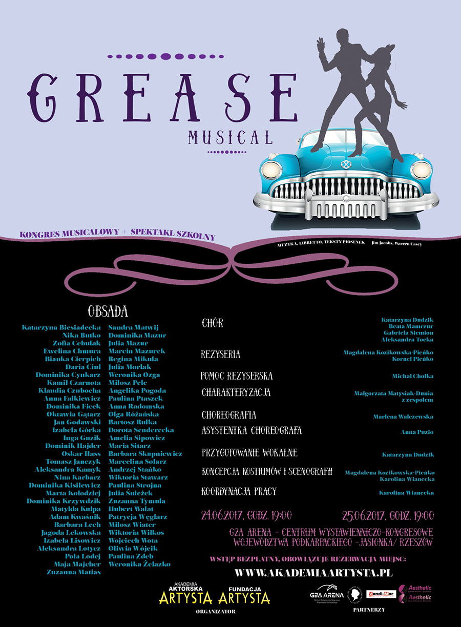 „Grease” - uniwersalna i ponadczasowa historia o wakacyjnych miłościach to barwne wizualnie i porywające tanecznie widowisko w klimacie muzycznym i kostiumowym z lat 70'. Przygotowana została w Akademii Aktorskiej Artysta, a wykonawcami są młodzi i dorośli uczestnicy kursów prowadzonych przez tę młodą, ale już cieszącą się uznaniem szkołę aktorską w Rzeszowie. Tegoroczne wydarzenie jest podsumowaniem roku pracy.