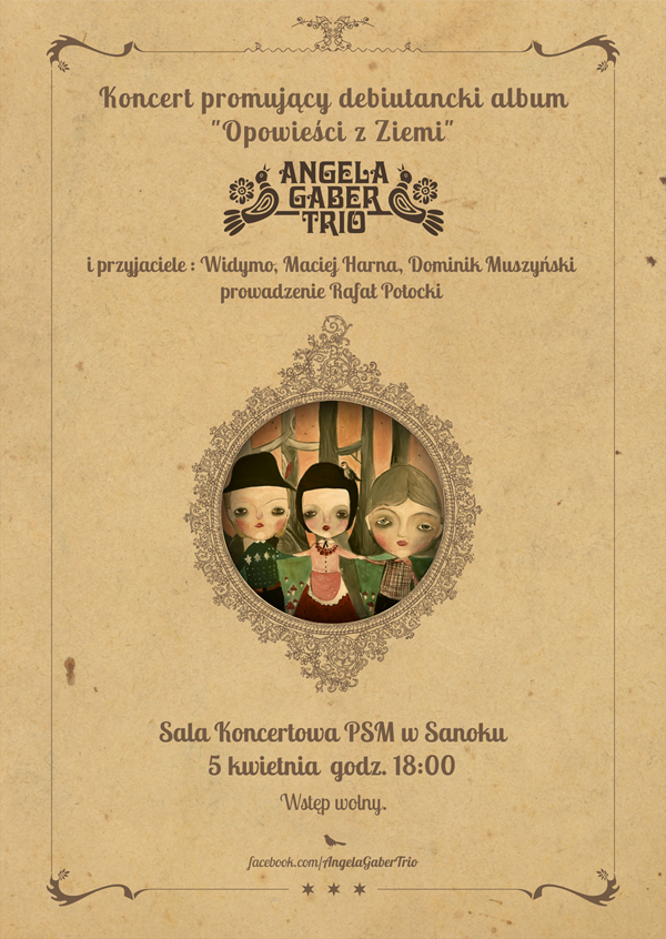 Koncert premierowy płyty „Opowieści z Ziemi” odbędzie się 5 kwietnia w sali koncertowej Państwowej Szkoły Muzycznej w Sanoku. Wraz z zespołem wystąpią zaprzyjaźnieni artyści – Dominik Muszyński, Maciej Harna oraz zespół Widymo. Zespół ma już zaplanowane koncerty na festiwalach w całej Polsce. -Zaskakujący jest fakt, że częściej koncertujemy gdzieś w Polsce niż na Podkarpaciu. Może zmieni się to po wydaniu tej płyty? – zastanawia się wokalistka Angela Gaber Trio.