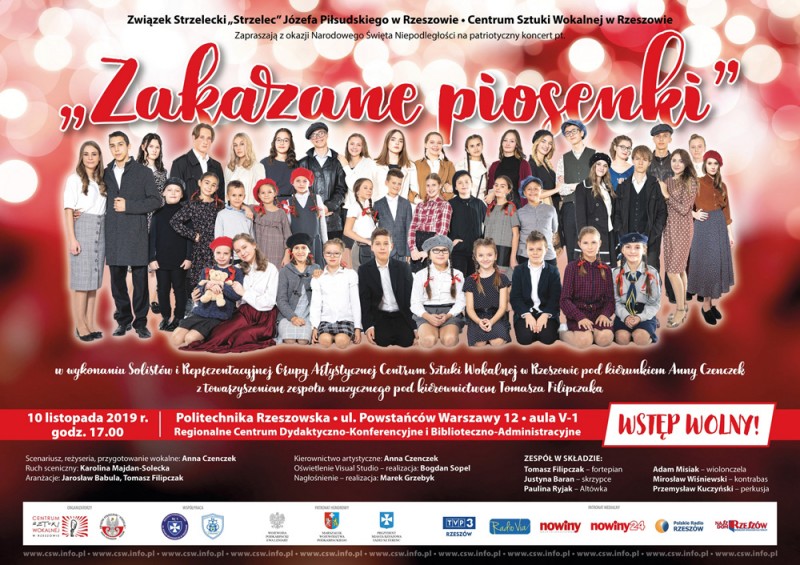 Związek Strzelecki „Strzelec” oraz Centrum Sztuki Wokalnej w Rzeszowie zapraszają na patriotyczny koncert „Zakazane piosenki”, który odbędzie się w niedzielę, 10 listopada na Politechnice Rzeszowskiej. Młodzi artyści wykonają zarówno pieśni żołnierskie, jak i te upamiętniające antyniemiecką i partyzancką twórczość muzyczną podczas II wojny światowej. Usłyszymy pieśni wojskowe, legionowe, a także utwory z filmu „Zakazane piosenki” w reżyserii Leonarda Buczkowskiego. Na scenie wybrzmi legendarna „Siekiera, motyka” czy „Warszawo ma”.