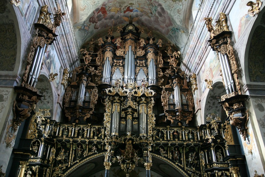 Budowę tego cuda ufundowała rodzina Potockich. Organy powstawały w dwóch etapach, w sumie obejmujących lata od 1680-1693. Na początku XX w. zostały przebudowane, ale szczęśliwie - w 1968 r. przywrócono należne im, barokowe brzmienie. Największa piszczałka ma 10 m długości! Instrument ten imponuje nie tylko swoimi możliwościami brzmieniowymi - np. głosami ptaków, czy bębnem. Zachwyca swą rozpiętością, którą tworzy chór muzyczny rozpostarty na całą szerokość korpusu nawowego i prospekty odpowiadające trzem nawom budowli.