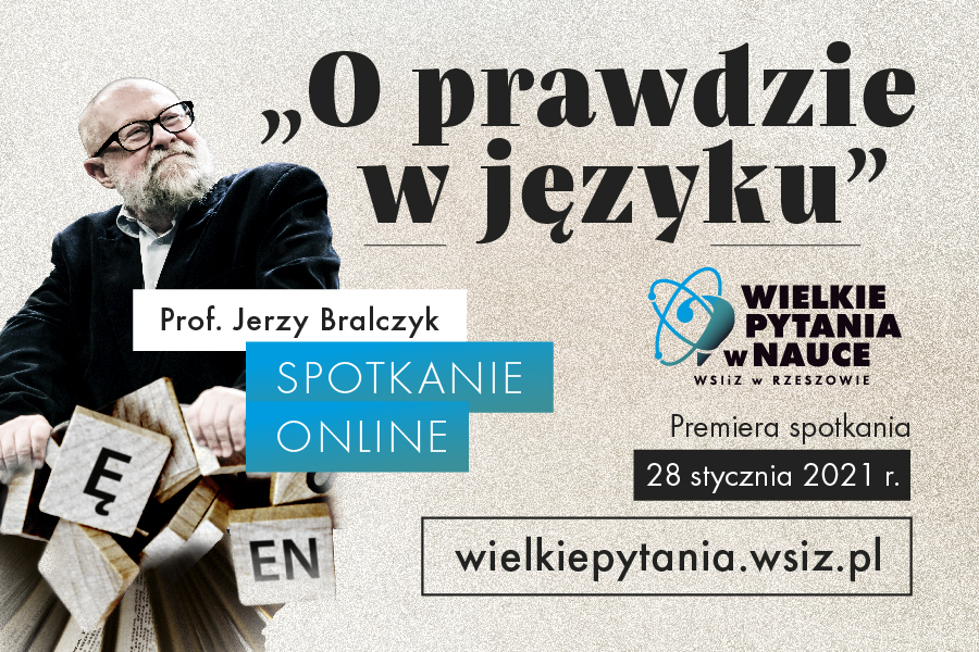 Prof. Jerzy Bralczyk – wybitny językoznawca, specjalista w zakresie języka mediów, reklamy i polityki – 28 stycznia o godz. 18 wygłosi w Wyższej Szkole Informatyki i Zarządzania wykład pt. „O prawdzie w języku". Spotkanie odbędzie się w ramach V edycji cyklu „Wielkie Pytania w Nauce” i będzie częścią obchodów jubileuszu 25-lecia WSIiZ.  Ze względu na pandemię Covid-19 wykład będzie online i będzie miał charakter otwarty. Premiera wydarzenia rozpocznie się w mediach społecznościowych na kanale YouTube i Facebooku WSIiZ.