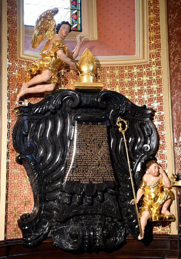Marmurowy nagrobek biskupa Fredry składa się z dwóch części rozmieszczonych po obu stronach ołtarza. Po stronie lewej (od patrzącego) anioł odsłania kotarę kryjącą kartusz z tablicą inskrypcyjną. Wymienia ona tytuły i zasługi biskupa. Po stronie prawej umieszczono owalny wizerunek biskupa Fredry (płaskorzeźba polichromowana). Zmarłemu towarzyszy Chronos z kosą oraz padający na kolana jednorożec z herbu Bończa.