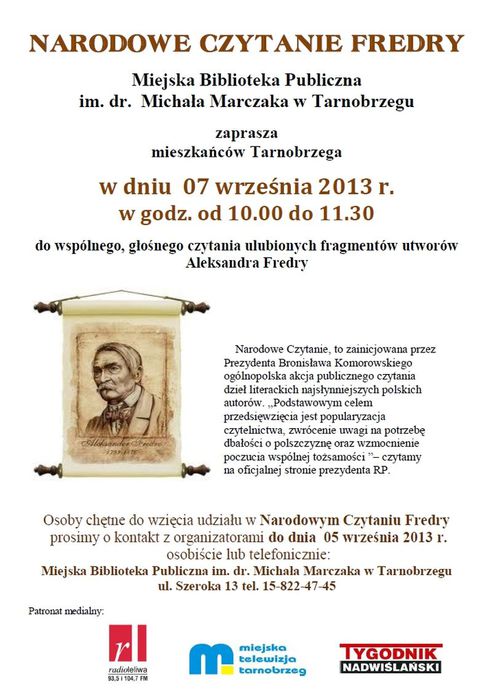 Wojewódzka i Miejska Biblioteka Publiczna zaprasza na parking przy ul. Sokoła 13, gdzie w godz. 15.00-16.00 odbędzie się wspólne czytanie fragmentów najbardziej znanych wierszy i komedii A. Fredry. Uczestnicy akcji dostaną gotowe teksty, mile widziane będą dzieła Fredry z domowej biblioteki. Czytaniu towarzyszyć będą liczne atrakcje m.in. rodzinne quizy i minikonkursy z nagrodami. Nie zabraknie ciekawostek z życia A. Fredry oraz cytatów. Propozycją dla najmłodszych będą animacje, warsztaty plastyczne, gry oraz zdjęcia z ciekawymi fredrowskimi postaciami. W godz. 11.00-17.00  - będzie odbywać się kiermasz książek używanych.