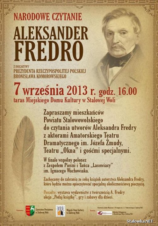 Aktorzy teatrów działających przy Miejskim Domu Kultury w Stalowej Woli wraz z mieszkańcami Powiatu Stalowowolskiego w plenerze, na placu przy Miejskim Domu Kultury, o godz. 17.30 rozpoczną czytanie wybranych utworów A. Fredry. Amatorski Teatr Dramatyczny im. Józefa Żmudy przedstawi inscenizację „Zemsty”, a Teatr „Okna” - „Ślubów panieńskich”. O oprawę muzyczną zadbają podopieczni Państwowej Szkoły Muzycznej im. I. Paderewskiego w Stalowej Woli. Zostaną zagrane utwory F. Chopina oraz S. Moniuszki.