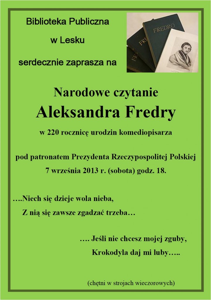 Utwory Aleksandra Fredry czytane będą w godz. 10.00-13.00 w Miejskiej Bibliotece Publicznej oraz na Rynku przed ratuszem. Dla dzieci zostanie przygotowany kącik plastyczny i kolorowanki z bajkowymi postaciami. Czytaniu towarzyszyć będą konkursy, rebusy i quizy w oparciu o znane cytaty, tytuły i postaci dzieł literackich Aleksandra Fredry. Na tle stylowej scenografii pojawią się harcerze ubrani w stroje z epoki, którzy przedstawią epizody sceniczne. Czytającym oraz najwytrwalszym uczestnikom zostaną wręczone upominki i nagrody. Na koniec wspólne wyrecytowany zostanie wiersz „Paweł i Gaweł”, a w budynku biblioteki będzie można obejrzeć wystawę „Humorzasty pan hrabia Fredro”.