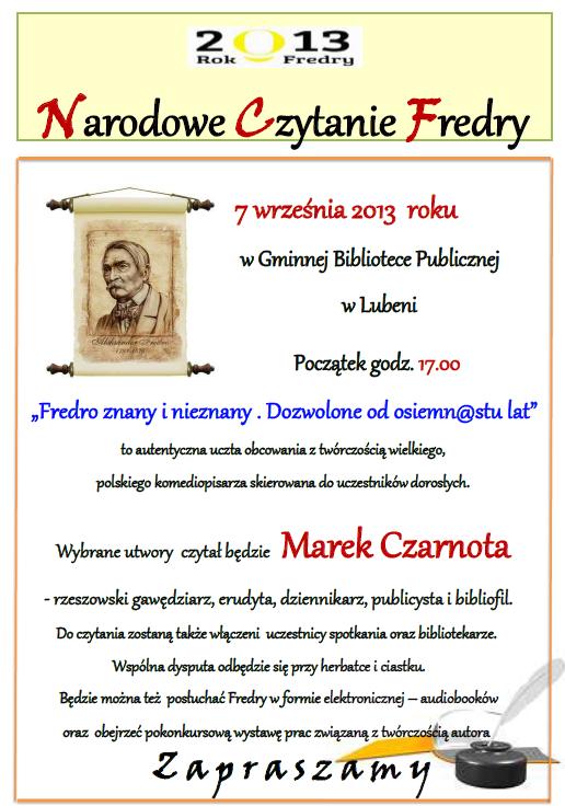 W Gminnej Bibliotece Publicznej przygotowano blok „Fredro znany i nieznany. Dozwolone od osiemn@stu lat”, czyli twórczość wielkiego komediopisarza skierowana do dorosłych uczestników. Do Narodowego Czytania zaproszony został znany rzeszowski gawędziarz, erudyta, dziennikarz, publicysta i bibliofil - Marek Czarnota, który przybliży zebranym sylwetkę Fredry. Dodatkowo będzie można posłuchać utworów Fredry w formie audiobooków oraz obejrzeć pokonkursową wystawę prac związana z twórczością autora.