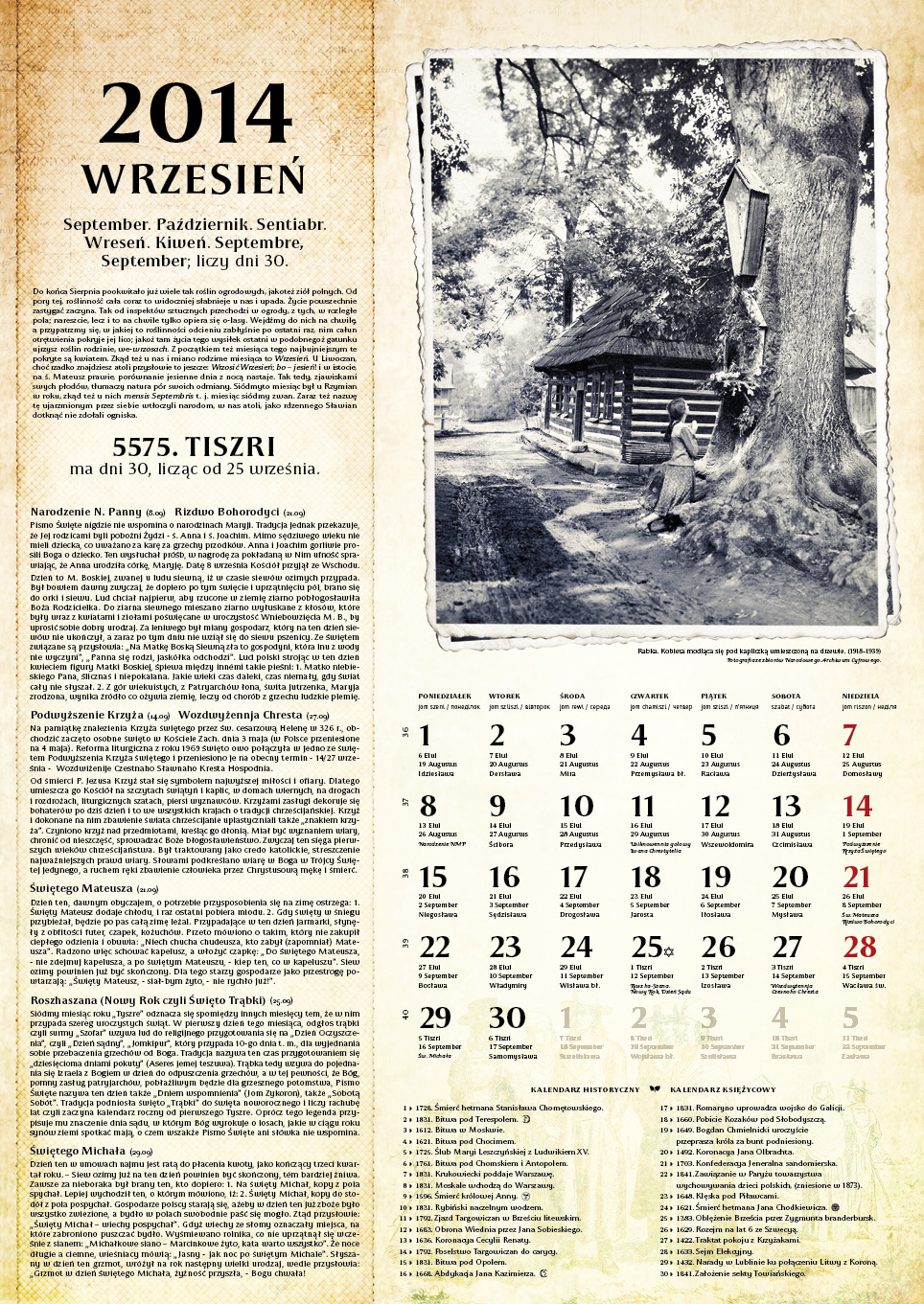 Kalendarz zawiera 3 kalendaria - gregoriańskie, juliańskie oraz żydowskie, kalendarz zodiakalny, oznaczenia właściwe dla danego obrządku lub religii oraz fotografie pochodzące ze zbiorów Narodowego Archiwum Cyfrowego.