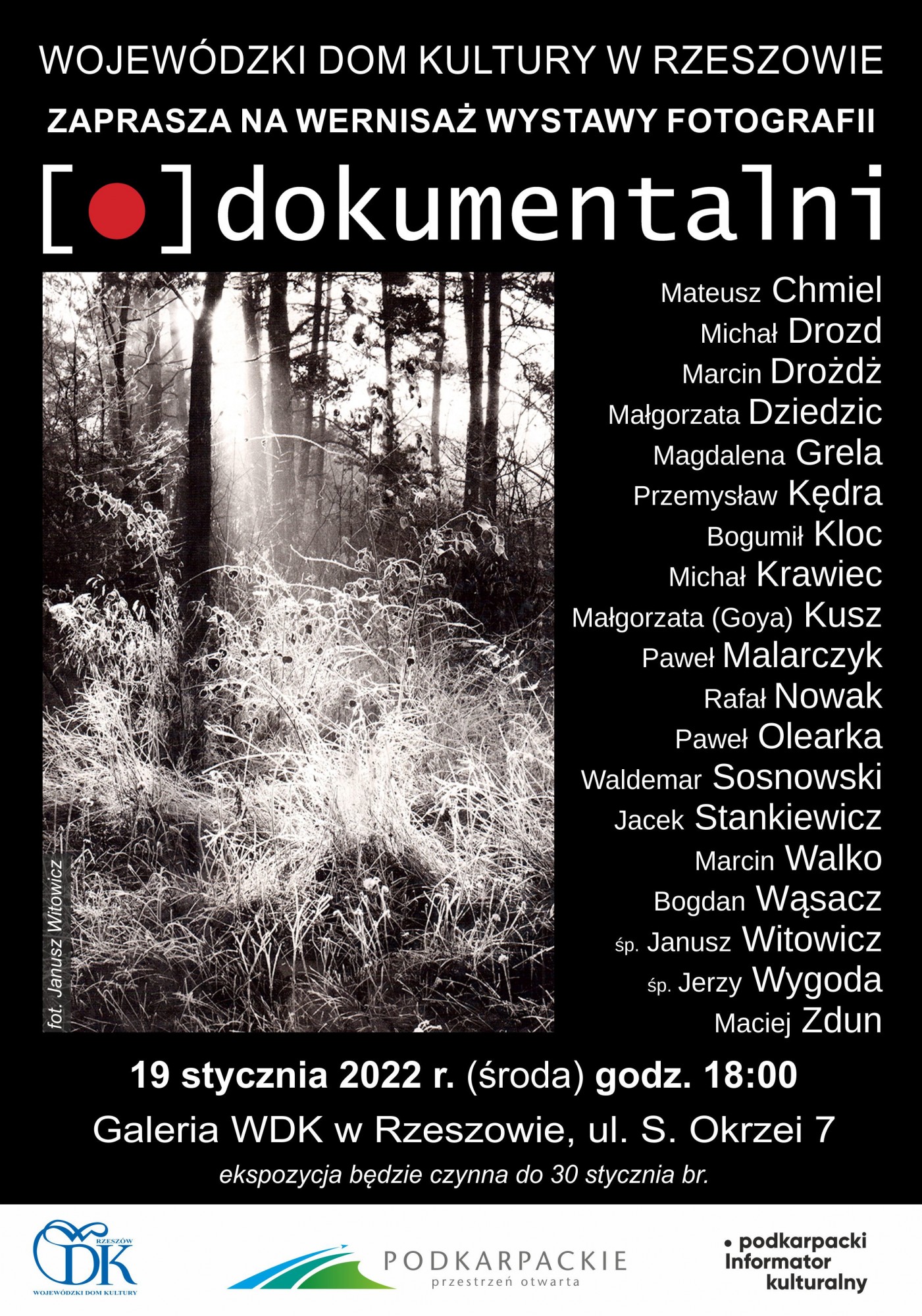 Nieformalną grupę Dokumentalni tworzą fotograficy związani z Podkarpaciem. Po raz pierwszy spotkali się na wspólnej wystawie w Pubie-Galerii Stara Drukarnia w Rzeszowie. Efektem spotkania była otwarta w 2019 roku w BWA w Rzeszowie pierwsza wystawa pt. „Dokumentalni” – międzypokoleniowa wystawa dokumentalistów z całego województwa, których połączyło wspólne zainteresowanie reportażem i fotografią dokumentalną. Po niemal trzech latach Dokumentalni powracają, a wnętrza otwarła dla nich Galeria WDK w Rzeszowie. Od środy, 19 stycznia, obejrzeć w niej można prace takich twórców jak: Mateusz Chmiel, Michał Drozd, Marcin Drożdż, Małgorzata Dziedzic, Magdalena Grela, Przemysław Kędra, Bogumił Kloc, Michał Krawiec, Małgorzata (Goya) Kusz, Paweł Malarczyk, Rafał Nowak, Paweł Olearka, Waldemar Sosnowski, Jacek Stankiewicz, Marcin Walko, Bogdan Wąsacz, Maciej Zdun. Będą także fotografie, dwóch znakomitych, lecz nieżyjących już autorytetów rzeszowskiego środowiska fotograficznego – Janusza Witowicza i Jerzego Wygody.
