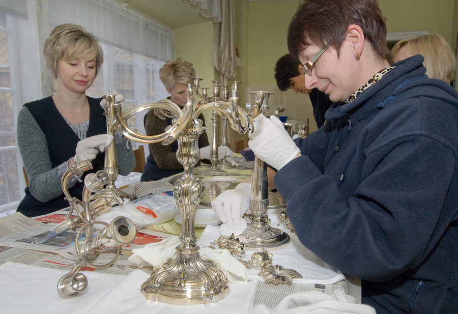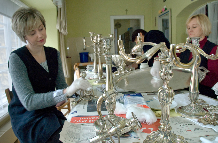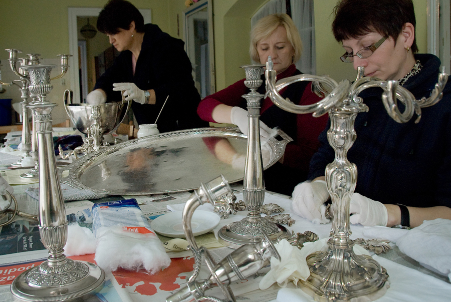 Warto tez zaznaczyć, że czyszczenie srebra i mosiądzu ( m. in. klamki przy drzwiach i oknach) odbywa się starymi metodami, tzn. mieszanką ( wykonaną przez Dział Konserwacji) składającą się z kredy szampańskiej i wody amoniakalnej do srebra oraz kredy i denaturatu do mosiądzu.  W czasie sprzątania wykonuje się też  bukiety z suchych kwiatów, z których słynie zamek w Łańcucie. Układają je panie zatrudnione w Dziale, z materiału osobiście przygotowanego w czasie sezonu.