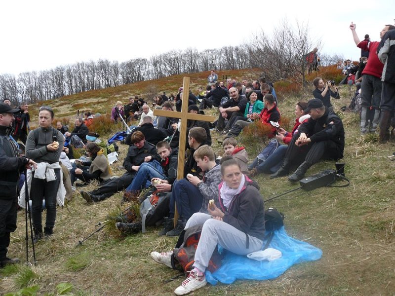 Na szczycie reprezentowane były bodaj wszystkie  strony Podkarpacia. Tuż po nas przyszła pielgrzymka rzeszowskich podhalańczyków z ks. dr. Sebastianem Piekarskim z parafii garnizonowej. Jak zwykle, ruch wokół krzyża, posiłek, pamiątkowe zdjęcia… A na mnie największe wrażenie zrobili pielgrzymi, którzy nie poddali się temu rozgardiaszowi, tylko dotykając krzyża, żarliwie się modlili. U stóp  umieszczono znicze, chorągiewki… Znów będzie się wkurzać straż parkowa i działacze PTTK, którzy uważają to za śmiecenie. Jak mi  kiedyś tłumaczyli, ktoś ( czyt. oni) musi później to wszystko sprzątnąć i znieść na dół.