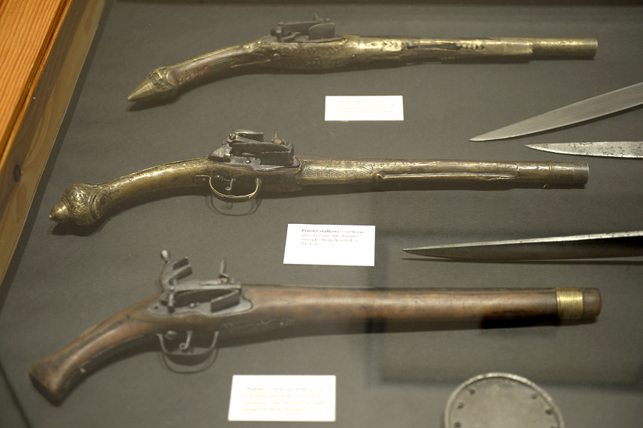 Broń, m.in. pistolet skałkowy (w środku) z XVIII wieku. Archiwum www.binzesistyl.pl