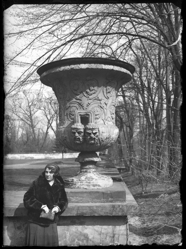Fot. nr 957. Helena Stanisz, z domu Janusz stoi obok  barokowego wazonu zdobiącego do dziś park Łazienkowski. Fot. Archiwum Galeria Fotografii Miasta Rzeszowa