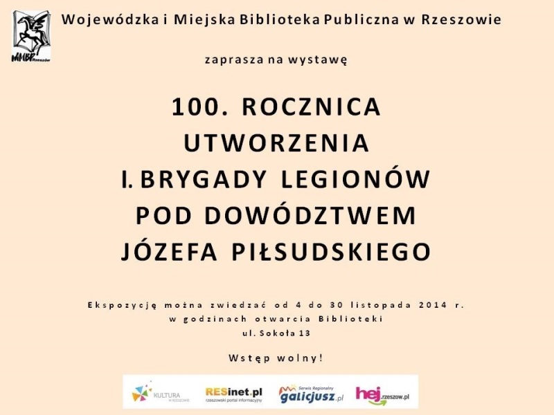 W 100-lecie utworzenia I Brygady Legionów pod dowództwem Józefa Piłsudskiego Wojewódzka i Miejska Biblioteka Publiczna w Rzeszowie przygotowała ekspozycję prezentującą genezę powstania Legionów. Wystawę można zwiedzać do 30 listopada, wstęp wolny.