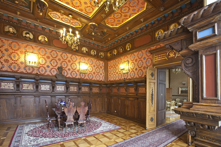 Z klatki schodowej otwiera się amfilada wnętrz parteru. Sala Portretowa z wizerunkami członków rodu, z drewnianą neogotycką boazerią, za którą ukryte jest dyskretne (omijające główną klatkę schodową) przejście na piętro. Za nią sale: Herbowa i Kominkowa pełniące rolę eleganckiej jadalni i pokoju klubowego. Drewniana klatka schodowa prowadzi na drugą kondygnację. To reprezentacyjne piano nobile, gdzie mieści się słynna Komnata Mikołaja Reya. Ozdabia ją ciężki kasetonowy strop i neorenesansowe boazerie zdobione cytatami z pism „ojca języka polskiego”. Czterowiersze brzmią bardzo współcześnie. Na przykład: