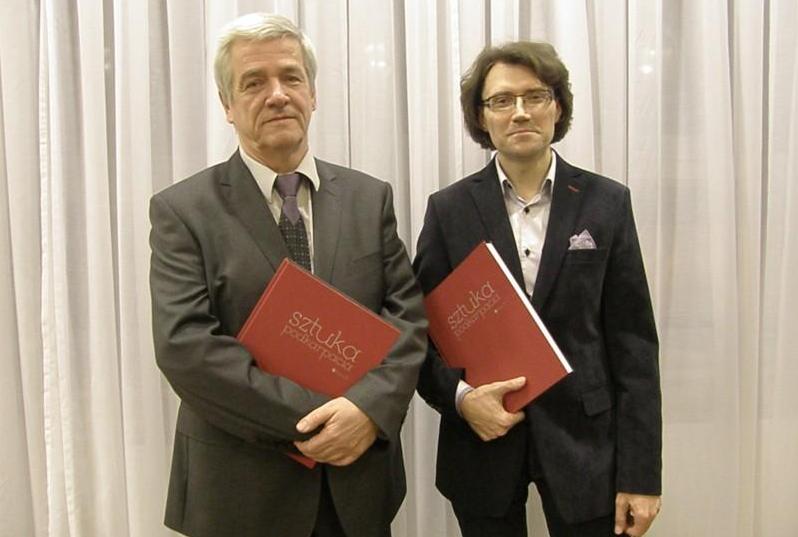 od lewej: Jacek Nowak prezes Podkarpackiego Towarzystwa Zachęty Sztuk Pięknych, pomysłodawca albumu oraz Adam Głaczyński, dziennikarz Radia Rzeszów prezentują wydawnictwo "Sztuka Podkarpacia"
