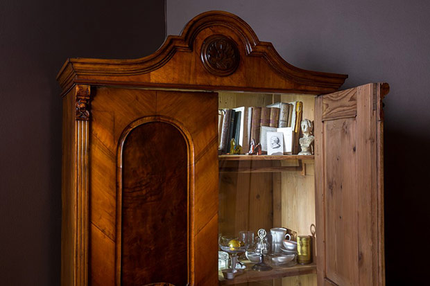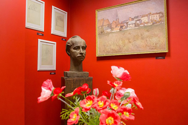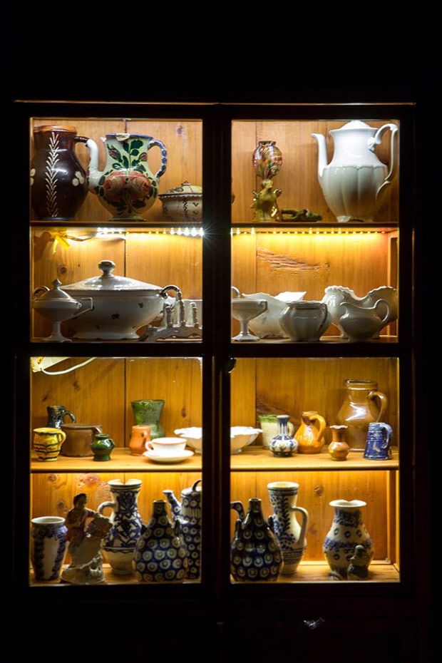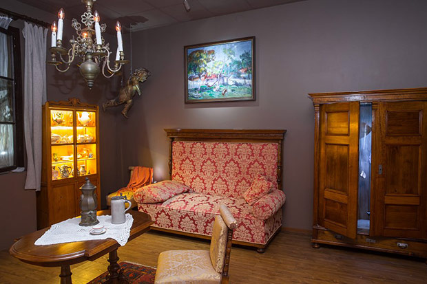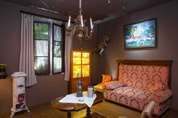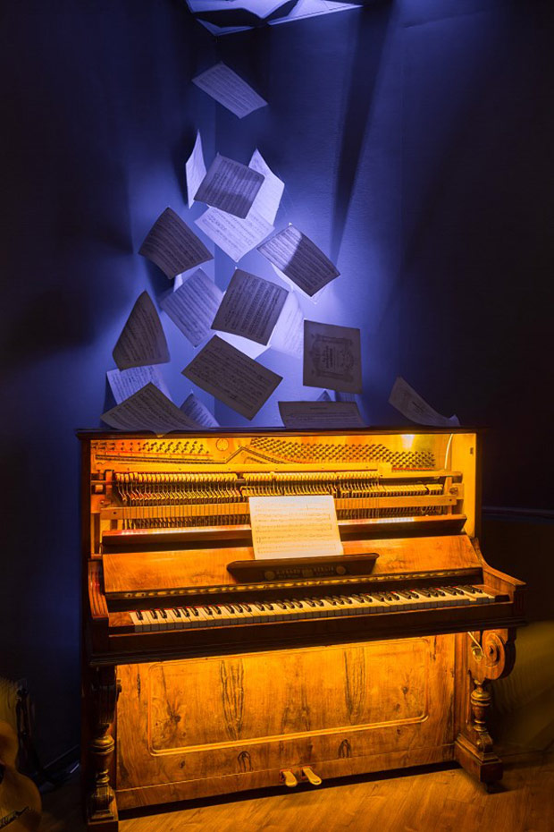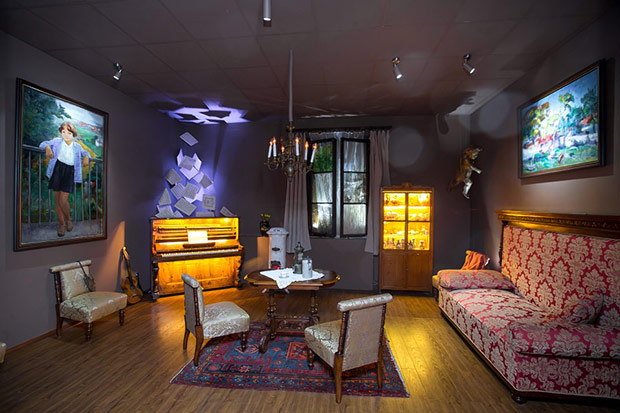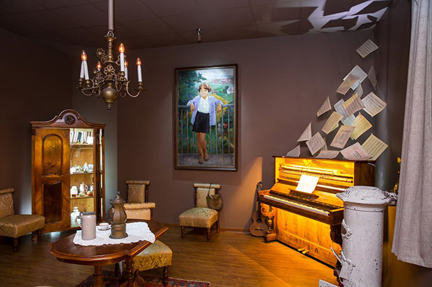 Wchodzimy do salonu, gdzie ustawiono meble przeniesione z domu Weissów w Kalwarii Zebrzydowskiej. To nie tylko rekonstrukcja wnętrza, w którym królują dwa płótna: „Sad w Kalwarii” oraz „Portret syna” (wypożyczone od rodziny). To także własna kreacja Jarosława Figury: nad pianinem unoszą się w górę nuty tak, jakby dźwięki muzyki. W serwantce ustawiono fajansowe wazony i dzbanki, które pojawiają się na obrazach artysty. Poprzez lekko uchylone drzwi oglądamy „szafę snów”, w której wnętrzu śledzimy wzlatujące w górę bibeloty. Za oknem snop zboża jakby z „Wesela” Wyspiańskiego. Wstrzymam się od dalszego opisu. Obejrzyjcie sami. Tego nie zobaczycie w przeciętnym martwym muzeum zapełnionym planszami i gablotkami.