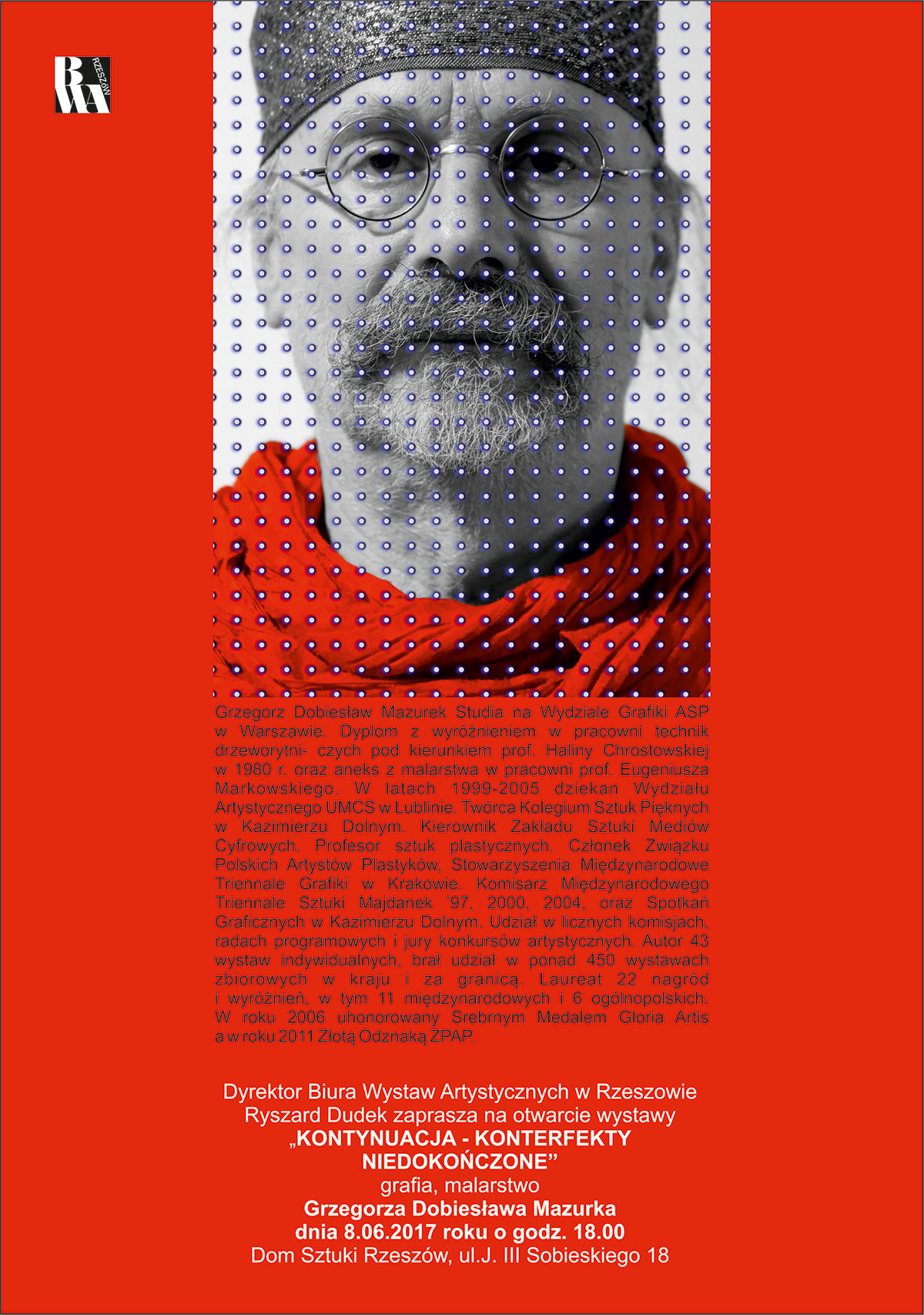 W drugiej sali wystawowej BWA, zostanie tego samego dnia otwarta wystawa malarstwa i grafiki Grzegorza Dobiesława Mazurka. Artysta urodził się w 1955 roku w Lublinie i z tym miastem związany jest do dziś. Ukończył studia na Wydziale Grafiki Akademii Sztuk Pięknych w Warszawie, zdobywając dyplom z wyróżnieniem w pracowni technik drzeworytniczych pod kierunkiem prof. Haliny Chrostowskiej oraz aneks z malarstwa w pracowni prof. Eugeniusza Markowskiego w 1980 r. W 2002 roku uzyskał tytuł profesora sztuk plastycznych. W latach 1999-2005 był dziekanem Wydziału Artystycznego Uniwersytetu Marii Curie-Skłodowskiej w Lublinie.