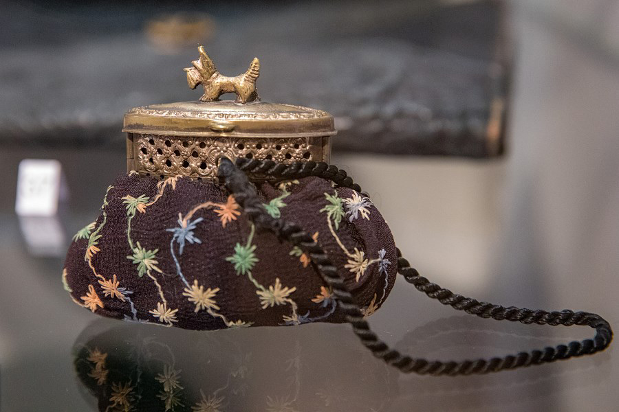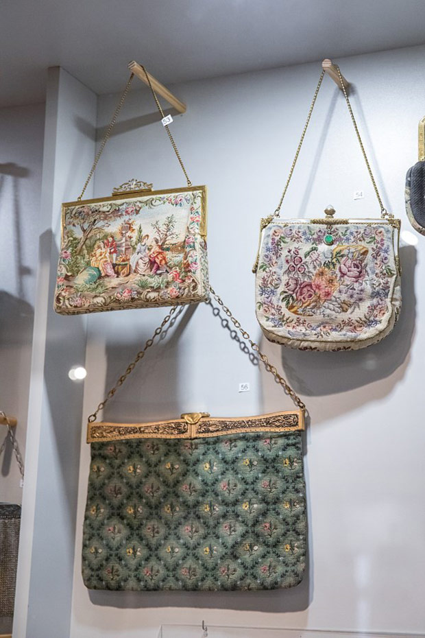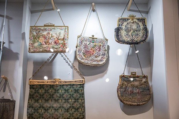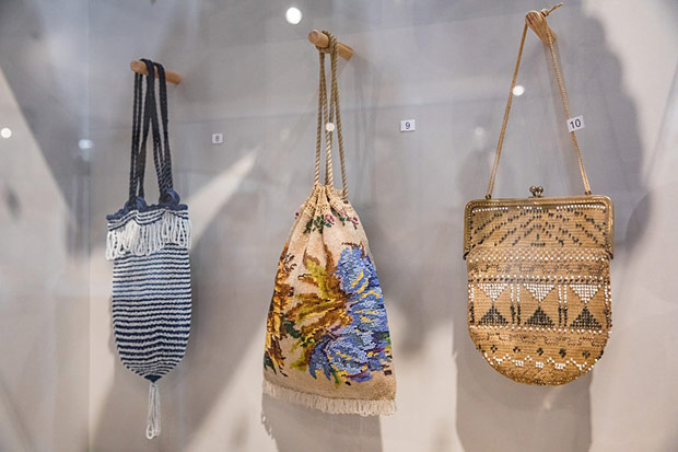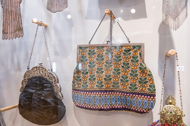 Wszechobecne na wystawie torebki to: biedermeierowskie woreczki haftowane koralikami, późniejsze pokrywane ściegiem petit point, tkane żakardowo, ujęte w metalowe ramki z łańcuszkami, zdobione ornamentami geometrycznymi, kwiatowymi w stylu secesji czy art deco. Motywami miniaturowych haftów są: portrecik, pejzaże, sielankowe sceny fete galante. Klasę jubilerskich wyrobów prezentują metalowe torebki ze srebra i alpaki wykonane z ogniwek połączonych pancerzowym splotem lub ze srebrnych płytek. Ciekawość budzą nietypowe kształty jak sakiewka w formie długiej pończochy, czy zameczek zwieńczony miniaturową figurką pieska. Jest też uszyta z rypsu i koronki torebka na okazję pierwszej komunii.