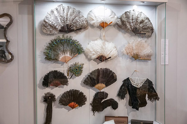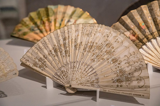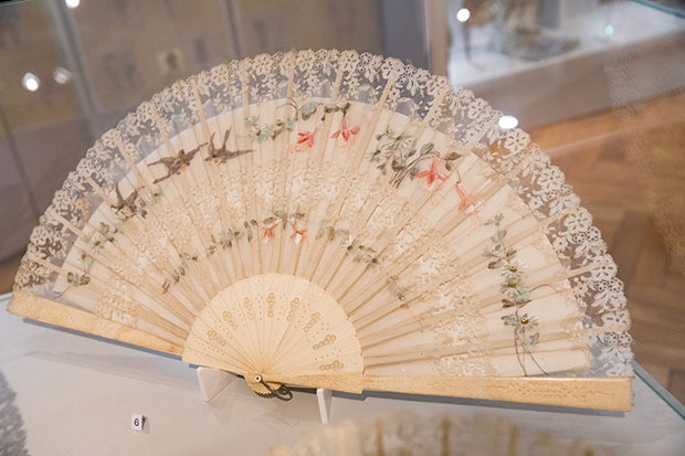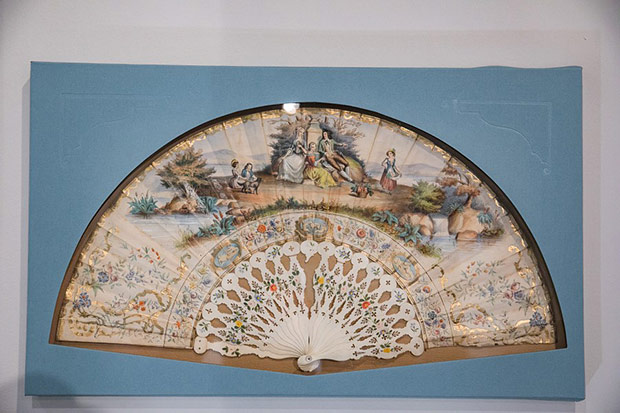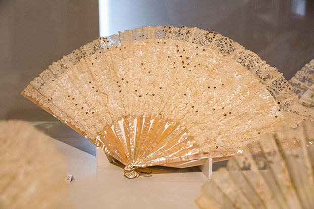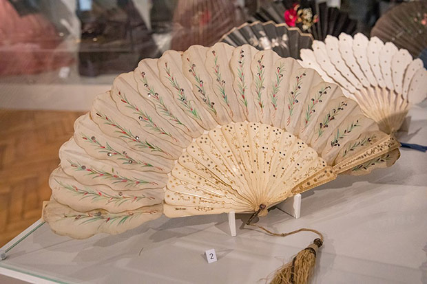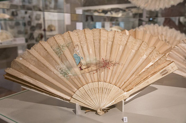 O ile torebka weszła do repertuaru kobiecej mody przy końcu XVIII w. to wachlarz – płaski przedmiot do chłodzenia znany był już w starożytności. Okres wielkiej popularności tego wytwornego przedmiotu przypadł na schyłek XVIII i całe XIX stulecie. Właśnie z tych czasów możemy podziwiać kolekcję wachlarzy europejskich i dalekowschodnich. Wykonane są z rzeźbionych w misterne ażury płytek z kości słoniowej i perłowej macicy, pokrywane jedwabiem, gazą, koronkami igiełkowymi i klockowymi. Malowane na tkaninie czy papierze nawiązują do stylistyki rokoka. Odrębną grupę stanowią wachlarze z piór: strusia, marabuta, pawia i łabędzia.
