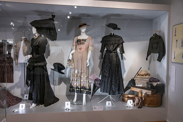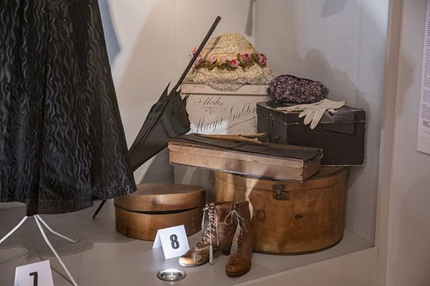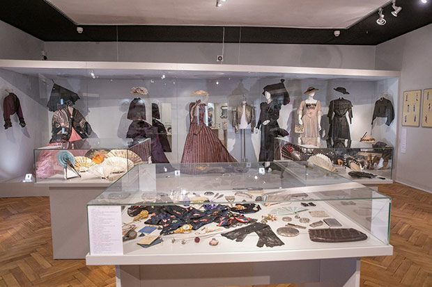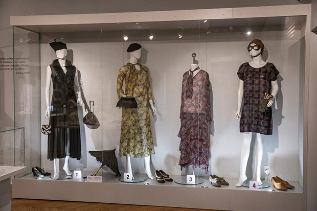 Kreacje z jedwabiu, rypsu, dekorowane gazą, koronkami, haftem stanowią tło dla zakupionych arcydziełek kunsztu kaletniczego, malarskiego, złotniczego. Ubiory uszeregowane zgodnie z chronologią pozwalają prześledzić ewolucję damskiej sylwetki od drugiej połowy XIX w. do międzywojnia, okresu rewolucyjnych zmian w modzie kobiecej. Od krynoliny z różowej tafty z czasów II cesarstwa przechodzimy do toalety uszytej z ciężkiego fioletowego rypsu o spódnicy z tiurniurą ( drapowany tył na poduszce lub stelażu) charakterystycznej dla lat 70-tych XIX w. Następne dziesięciolecie przyniosło architektoniczny, wypiętrzony kształt tiurniury. Ten model z tafty i jedwabnej mory w barwach turkusowych prezentuje toaleta z fantazyjnie uformowaną tiurniurą i dwoma stanikami ( ówczesne suknie były dwuczęściowe): spacerowym z dłuższym stanem i rękawami oraz balowym mocno wydekoltowanym z krótkimi rękawkami z gazy. Bardziej powściągliwa w kształcie suknia z XIX/XX w. nie posiada już tiurniury, lecz wachlarzowato układającą się spódnicę. Dopełnieniem są duże, bogate kapelusze. Cudeńka ze słomki, sztucznych kwiatów, gazy, fularu, aksamitnych i jedwabnych wstążek, bardzo niewygodne bo upinane na wysokich fryzurach mocno ograniczały ruchy. Przechowywano je w walcowatych pudłach służących również do ich transportu . Wystawiono je także z parasolkami i akcesoriami podróżnymi.