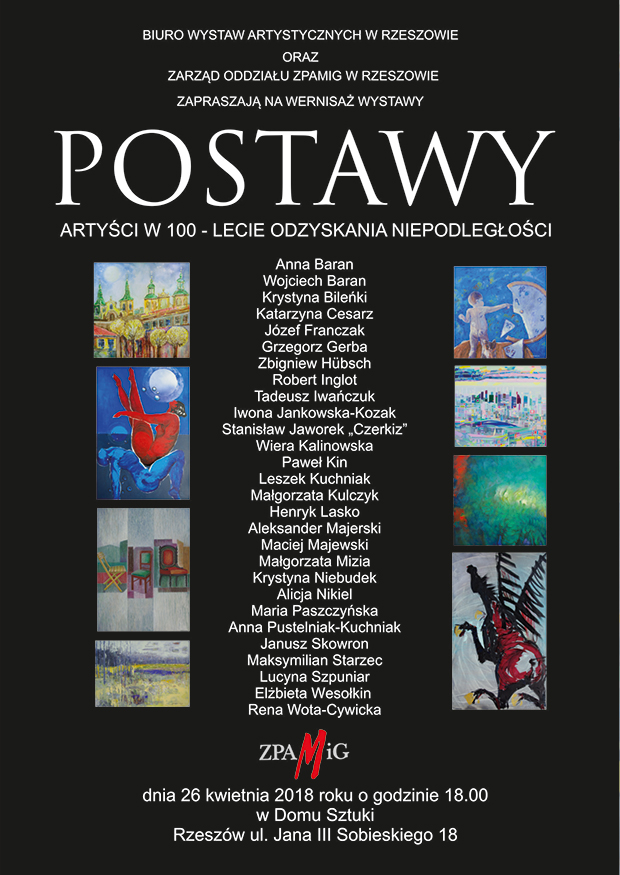 Drugą nowością w rzeszowskim BWA jest wystawa „Postawy – Artyści w 100 Rocznicę Odzyskania Niepodległości”. Zaprezentowane zostaną prace artystów plastyków zrzeszonych w Związku Polskich Artystów Malarzy i Grafików okręgu rzeszowskiego. Wystawa jest prezentowana w rzeszowskim BWA co dwa lata. Jest okazją do zaprezentowania dorobku i najnowszych osiągnięć artystycznych członków zrzeszonych w tym związku. Wystawa obejmie dzieła z zakresu różnych dyscyplin plastycznych: malarstwo, rysunek, pastele, akwarele i grafiki oraz rzeźby. Ponad 20 artystów wzięło udział w tegorocznej edycji, która jest poświęcona upamiętnieniu historycznemu wydarzeniu setnej rocznicy odzyskania niepodległości przez Polskę. Komisarzem wystawy jest obecny prezes okręgu artysta malarz Maciej Majewski, a projekt został zrealizowany w ramach zadania publicznego dofinansowanego przez Gminę Miasto Rzeszów.