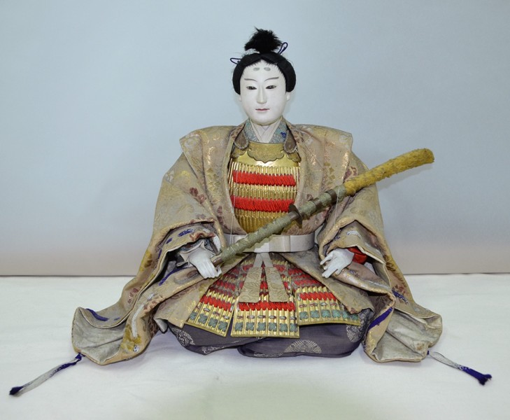 Lalka porcelanowa, japońska, siedzącego samuraja z okresu Edo (1850-1868). Lalka przedstawia postać młodego samuraja, ubranego w uroczyste kimono. Samuraj ma miecz typu katana. Lalka posiada naturalne włosy. Fot. Łukasz Kyc/Muzeum Podkarpackie w Krośnie