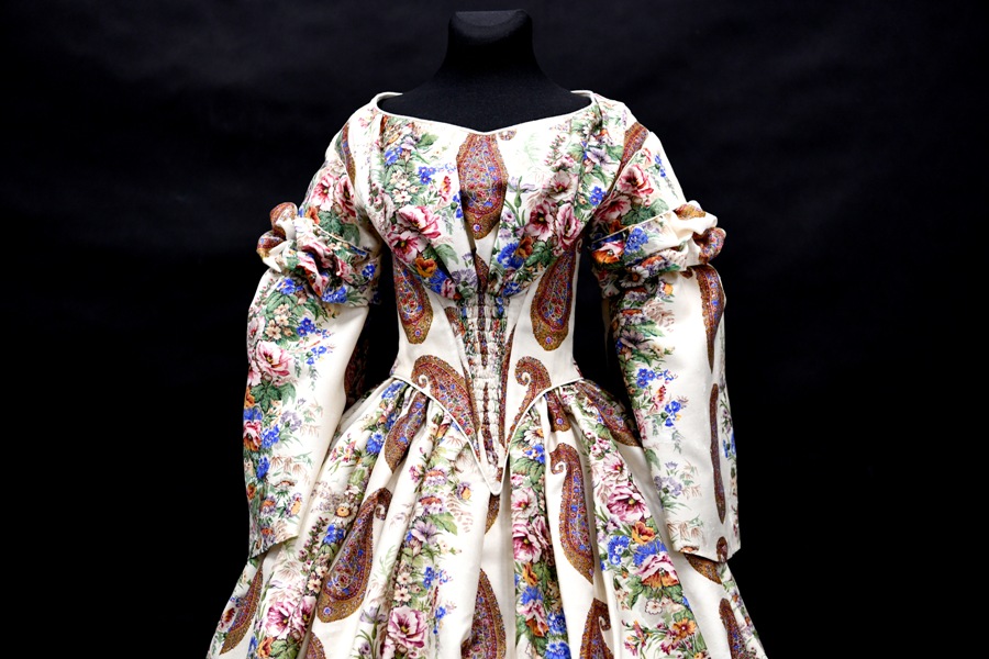 Trudno określić czy kaszmirowo-jedwabną kreację uszyto w kraju, czy może przywieziono ją z zagranicznych wojaży. Tkanina mogła zostać wyprodukowana w Anglii. Brytyjskie manufaktury słynące z doskonale drukowanych materiałów zatrudniały cenionych rysowników. Wzory początkowo subtelne, monochromatyczne wraz z doskonaleniem technik drukarstwa i farbiarstwa w XIX w. ewoluowały ku dekoracjom rozbudowanym kompozycyjnie i zróżnicowanym kolorystycznie. Przykładem tych ostatnich może być omawiana tkanina, w której zestawiono realistycznie potraktowane studia rodzimych polnych kwiatów z egzotycznym motywem bota rozpowszechnionym w Europie w końcu XVIII w. kiedy zapanowała moda na kaszmirskie szale.