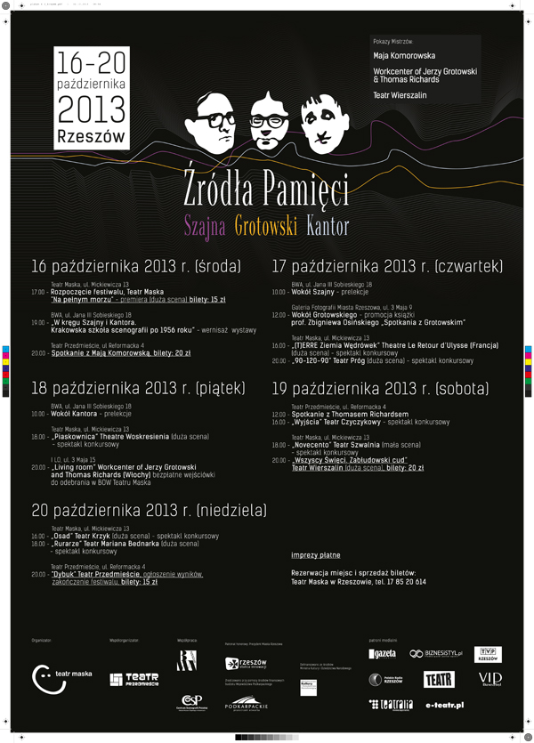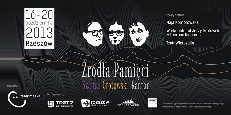 Źródła pamięci. Grotowski - Kantor - Szajna zorganizowane przez Urząd Miasta Rzeszowa potrwają w tym roku od 16 do 20 października. Większość spektakli, na które wstęp jest wolny, odbędzie się w Teatrze Maska. Tam też nastąpi otwarcie festiwalu i premiera tegoż teatru - „Na pełnym morzu”. Spotkania autorskie zaplanowane są w rzeszowskim BWA, zaś promocja książki prof. Osińskiego w Galerii Miasta Rzeszowa. Workcenter of Jerzy Grotowski and Thomas Richards w spektaklu „Living room” zobaczymy w Teatrze Przedmieście. Tam też w niedzielę przedstawieniem „Dybuk”  zakończy się festiwal.