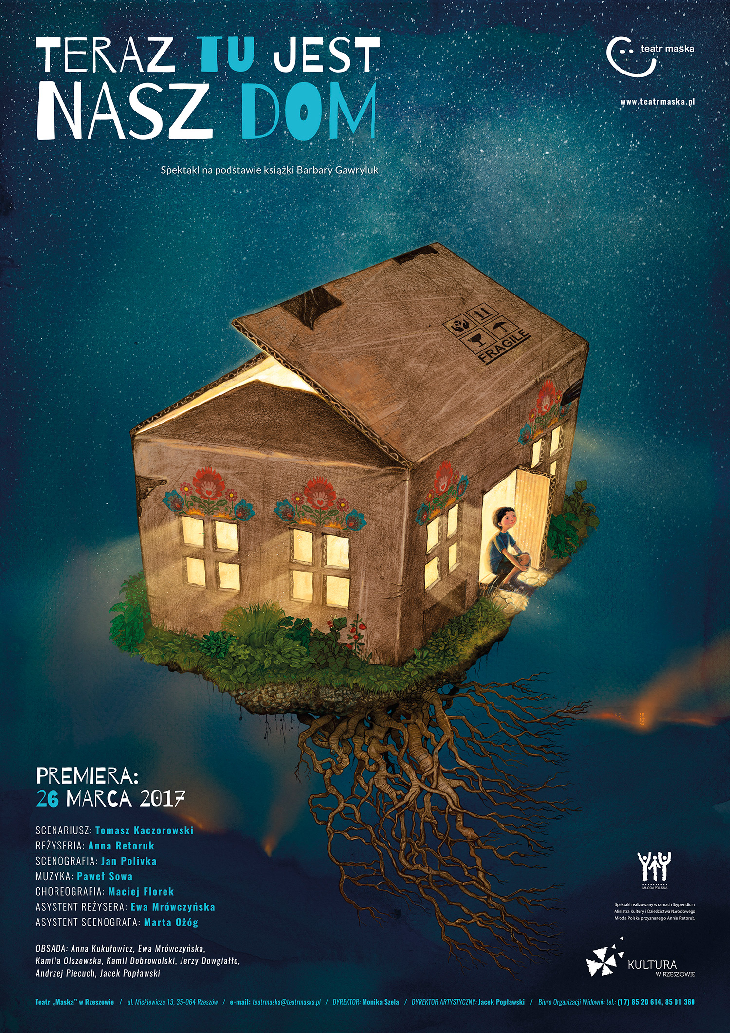 Teatr „Maska” w Rzeszowie, tuż przez Międzynarodowym Dniem Teatru, zaprasza na kolejną premierę sezonu 2016/2017. - Od 26 marca na naszej dużej scenie zobaczyć będzie można spektakl „Teraz tu jest nasz dom”, w reżyserii Anny Retoruk, dedykowany widzom od lat 7., także rodzicom, wychowawcom, dziadkom. Poruszamy temat uniwersalny, dotyczący życia każdego z nas. Tą premierą chcemy wzbudzić empatię, wrażliwość na innych ludzi, którzy muszą się przenieść z jednego miejsca na drugie, czasem nie ze swojej woli, zmuszeni wojną, trudnymi warunkami życia lub innymi okolicznościami – podkreśla Jacek Popławski, dyrektor artystyczny Teatru Maska.