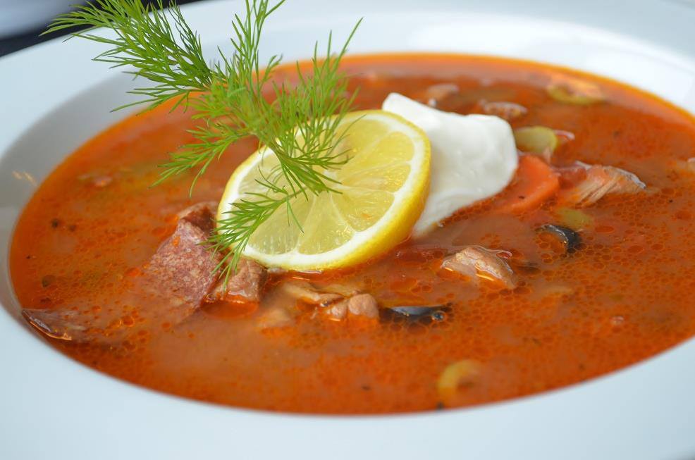 Solianka - kwaśna zupa z kawałkami wołowiny, wieprzowiny, salami, oliwkami, kaparami i pomidorami