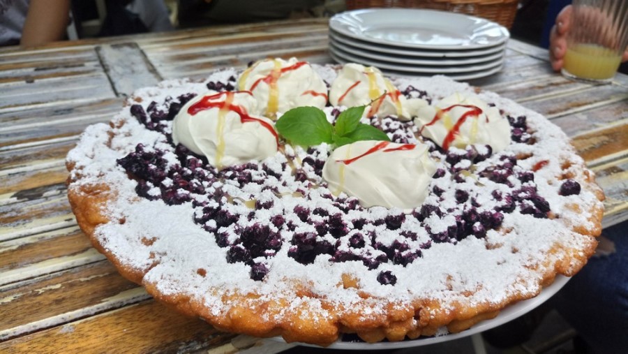Z jagodami, z cukrem, śmietanką, miętą, dla upartych może być z truskawkami i jogurtem, przepyszny naleśnik gigant z „Chaty Wędrowca” z  plackiem z jagodami, który smażyli Robert z Majstrem Biedą już niewiele ma wspólnego, ale przepyszny smak i zapach czarnych jagód pozostał ten sam.