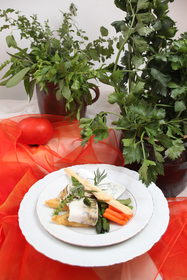 Sandacz z pary w towarzystwie warzyw