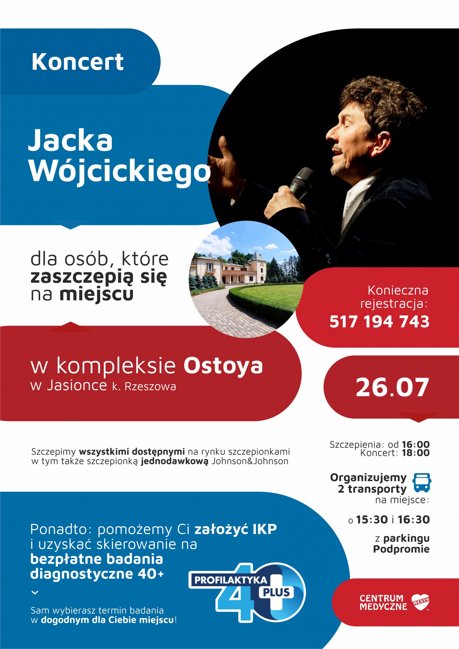 W poniedziałek, 26 lipca w kompleksie Ostoya w Jasionce k. Rzeszowa CM Medyk organizuje koncert Jacka Wójcickiego dla osób, które zechcą przyjechać i zaszczepić się przeciw COVID-19. Konieczna rejestracja pod numerem telefonu 517 194 743.