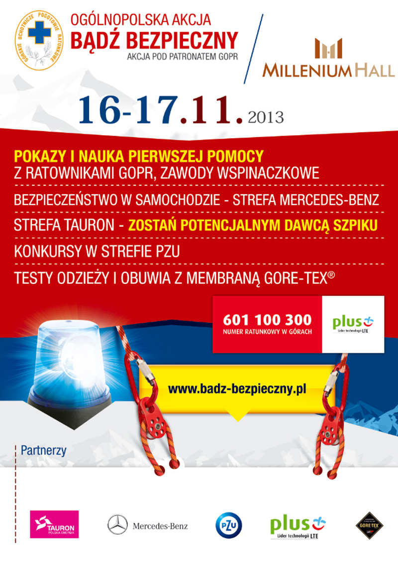 Szkolenia z udzielania pierwszej pomocy, konkursy i zabawy dla najmłodszych - to tylko niektóre z atrakcji przygotowanych w ramach kolejnej edycji akcji GOPR pod hasłem „Bądź bezpieczny”. Impreza odbędzie się w 16-17 listopada w Millenium Hall.