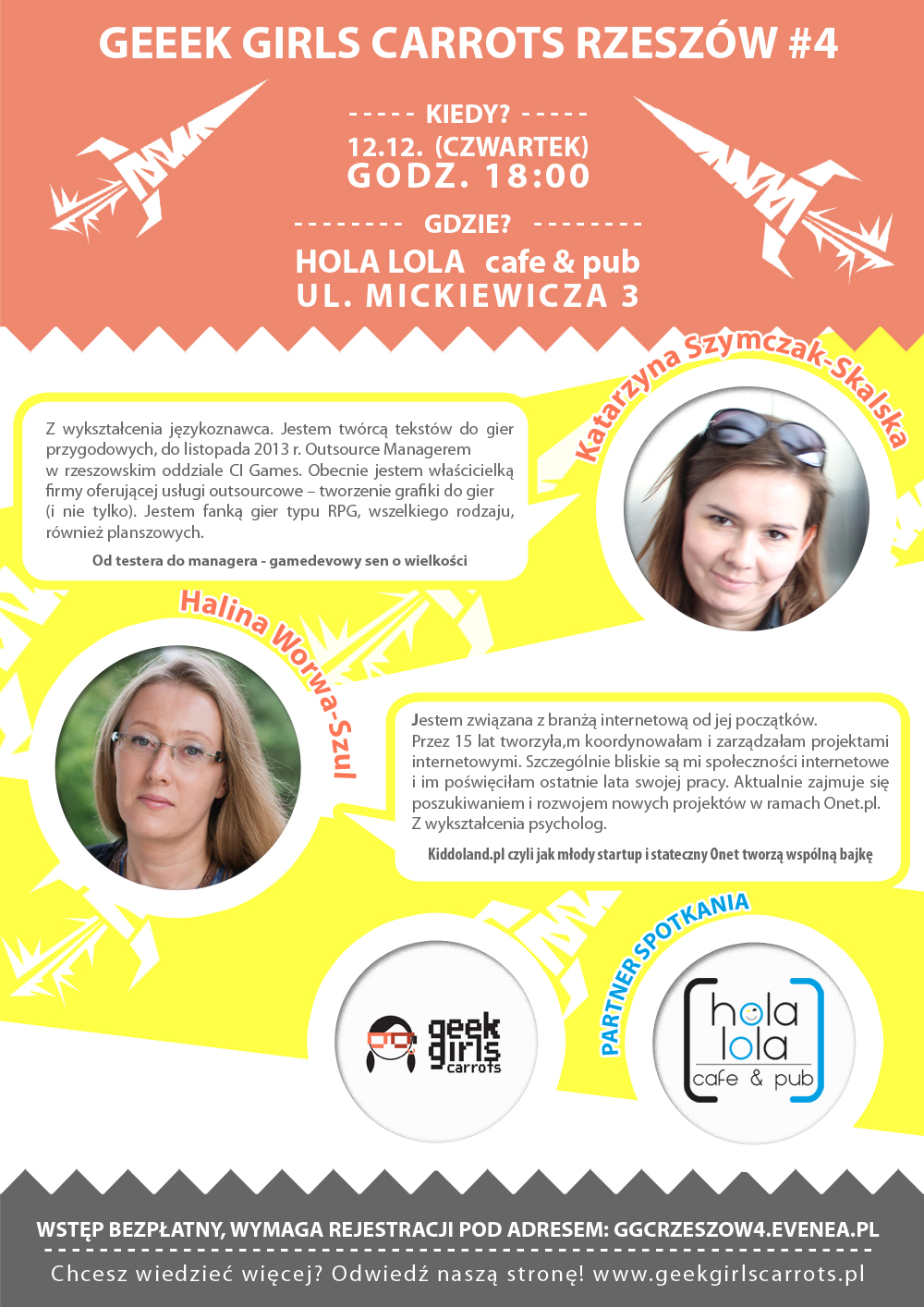 Czwarte spotkanie Geek Girls Carrots, czyli społeczności kobiet kochających nowe technologie, odbędzie się już 12 grudnia (czwartek) o godz. 18:00. Tym razem Karotki zagoszczą w nowym miejscu - klubokawiarni HOLA LOLA, ul. Mickiewicza 3 (zaraz obok rzeszowskiego rynku).