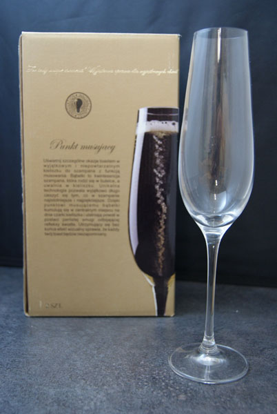 Bardzo ważne są kieliszki, do których nalejemy szampan. Powinny mieć wysoką i wąską czarkę, długą nóżkę. Ciekawą propozycję są kieliszki z punktem musującym, które powstały w Krośnieńskich Hutach Szkła Krosno S.A. i są wynikiem rozwoju wyrobów szklanych przeznaczonych do win musujących.