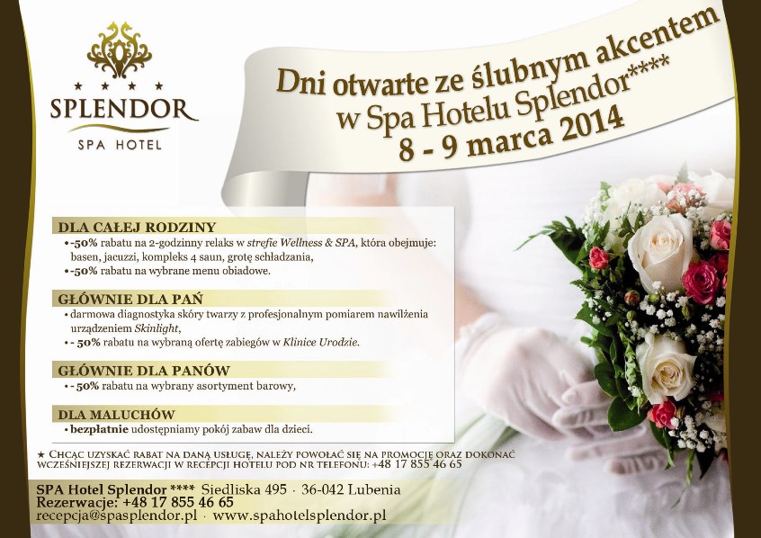8-9 marca 2014 r. w SPA Hotelu Splendor odbędą się Dni Otwarte ze ślubnym akcentem. To niebywała okazja na konstruktywne spędzenie weekendowych chwil całą rodziną. Moc atrakcji nie tylko dla Pań i dla Panów, lecz również dla dzieciaków! A oprócz tego mnóstwo promocji i rabatów, m.in. na relaks w strefie Wellness & SPA czy wybrane menu obiadowe.