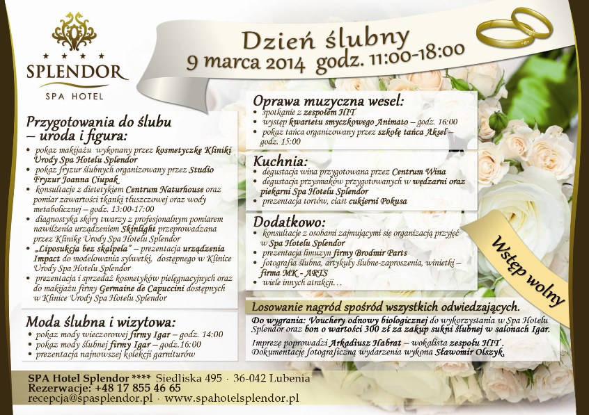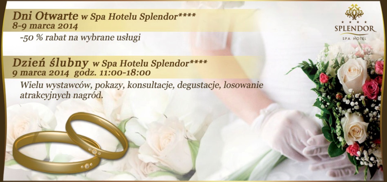 9 marca w SPA Hotelu Splendor poświęcony będzie tematyce ślubnej. Tego dnia odbędzie się m.in. pokaz makijażu, pokaz fryzur ślubnych, pokaz mody ślubnej i wizytowej. Oprócz tego odbędzie się spotkanie z zespołem weselnym, występ kwartetu smyczkowego, a także pokaz tańca organizowany przez profesjonalną szkołę tańca.