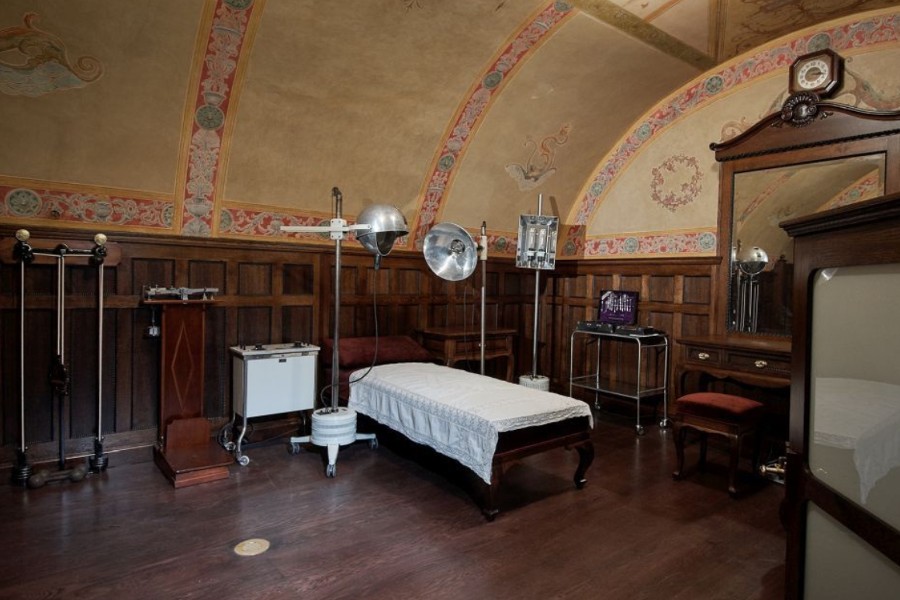 ·Założeniem prac było jak najwierniejsze skopiowanie wnętrz, poprzez zastosowanie oryginalnych elementów, takich jak np. podobne oryginalne kurki, rury, urządzenia natryskowe. Odtworzono również elegancki gabinet wypoczynkowy, wraz z meblami z drewna dębowego, a także jednobiegowe, drewniane dębowe schody, prowadzące z parteru do łaźni. Niezwykłym wyzwaniem było zrekonstruowanie instalacji wodno-kanalizacyjnych, a także wszystkich urządzeń kąpielowych, do masażu oraz fizjoterapii. W ramach przedsięwzięcia uzupełniono również ubytki w zachowanych kafelkach oraz w całości odtworzono ścienne malowidła.