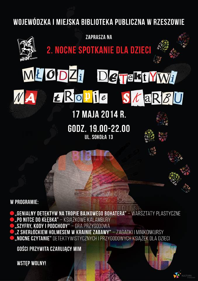 W sobotę 17 maja w godz. 19.00-22.00 zapraszamy na II.nocne spotkania dla dzieci "MŁODZI DETEKTYWI NA TROPIE SKARBU". Spotkanie odbędzie się w  ramach 6-tej Nocy Wojewódzkiej i Miejskiej Biblioteki Publicznej w Rzeszowie.